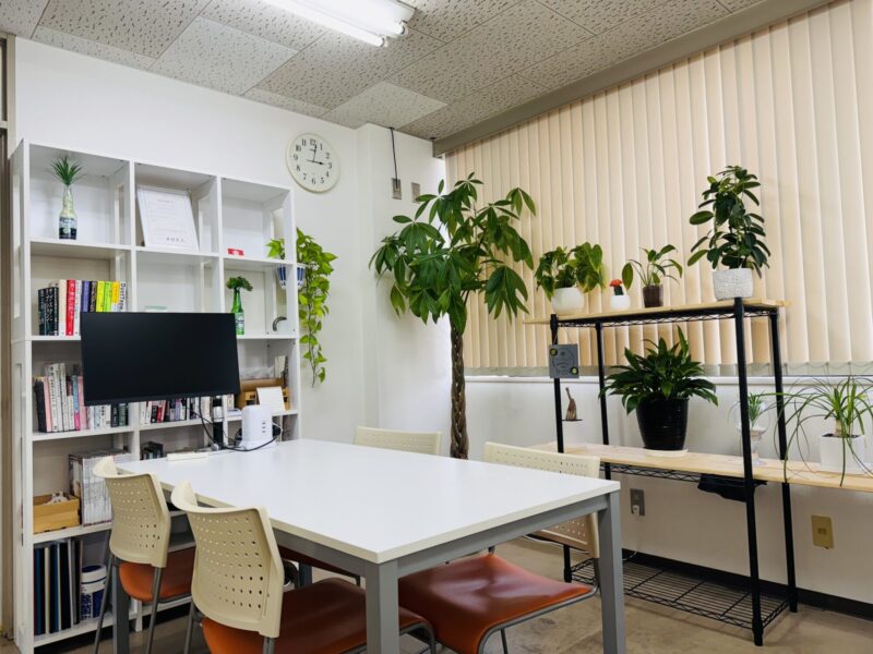 ナチュラルなインテリアと観葉植物が配置された打ち合わせルーム、落ち着きと温かみのある雰囲気を演出し、快適に働ける環境づくりが意識されています。観葉植物がとてもよく育つパワースポットです!